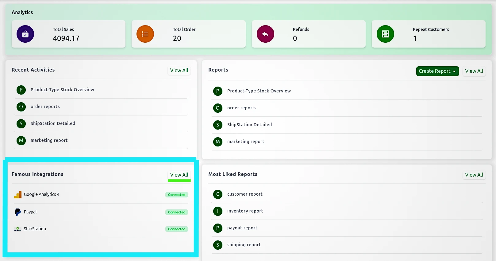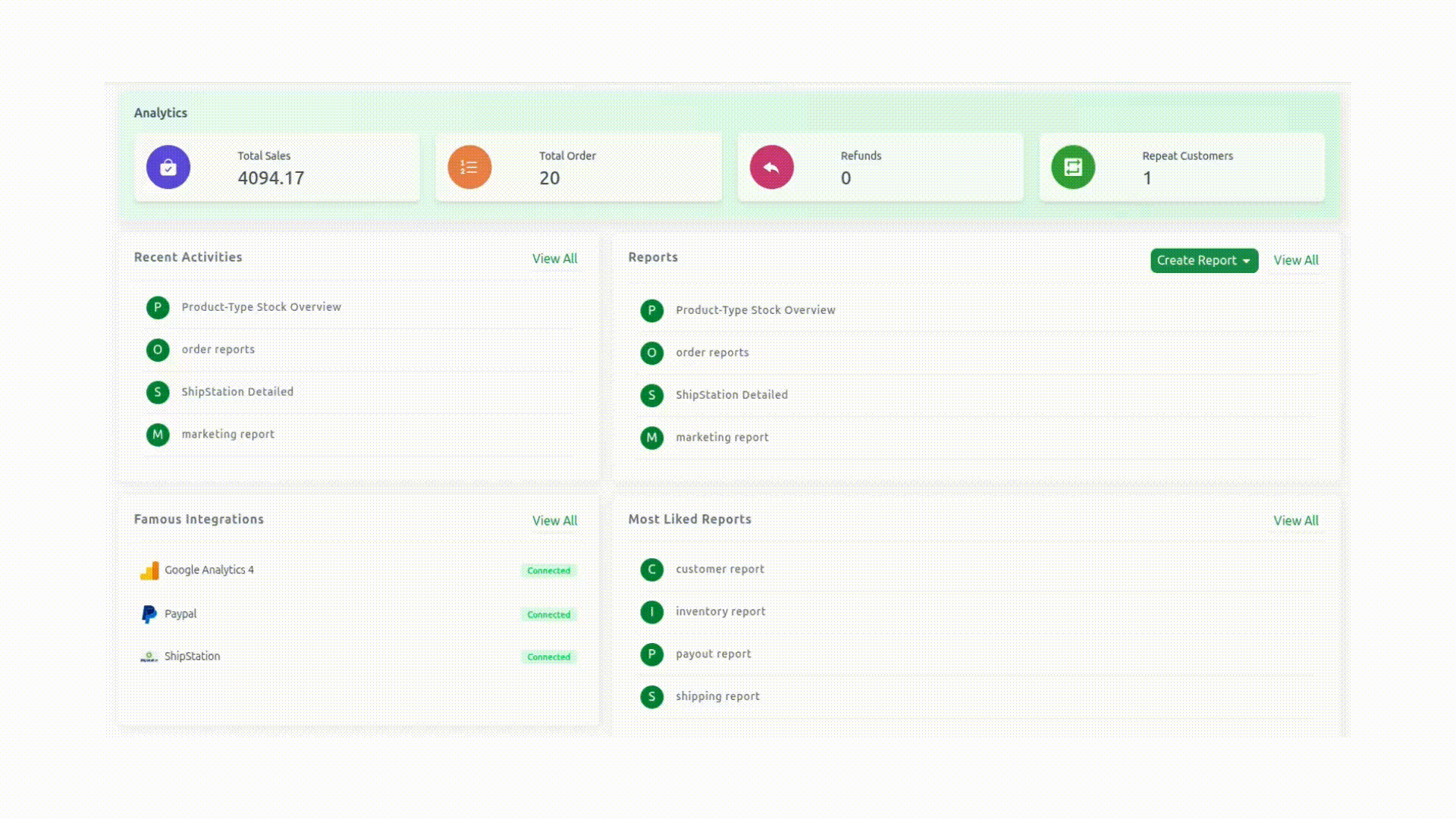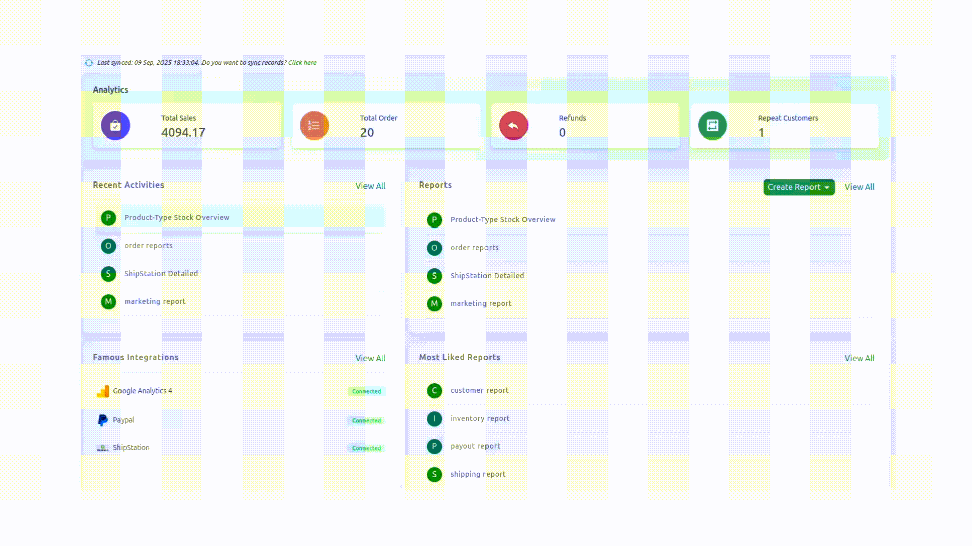 The Home page in ReportGuru.ai provides a quick overview of your account status, store performance, and recent activities. Itβs your starting point to stay informed about reports, integrations, and key metrics.