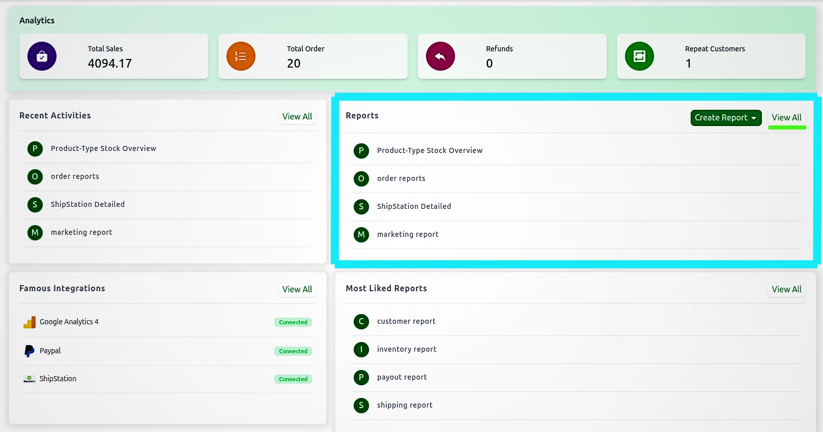 π Click View All at the bottom to explore the complete Most Liked Reports list, or click Create Report to build a new one.