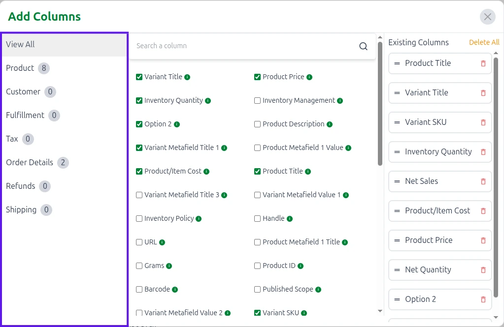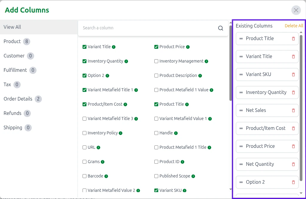 Select the data fields : Some related fields will be chosen by default. Add more via the Add Columns button. Use the search bar to quickly locate fields.