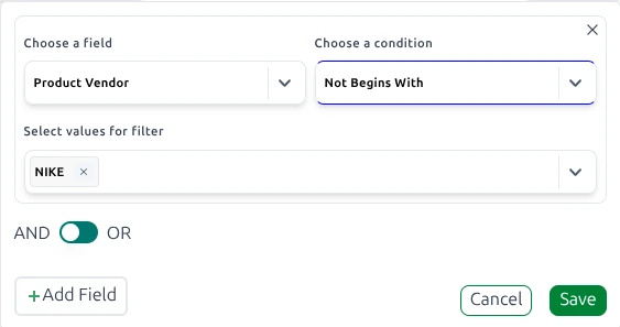 💡 The Not Begins With filter is ideal for excluding a specific brand, prefix, or series when you want to analyze the rest of your product data.