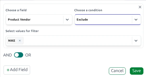 Using the same store, if you want to exclude all NIKE and Adidas products, apply the Exclude filter with the conditions “NIKE” and “Adidas”.