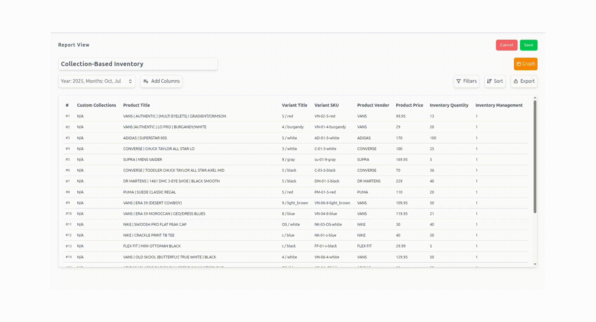 You can first sort Product Vendor in ascending order (A–Z) to group all ADIDAS, CONVERSE, NIKE, and VANS products together,